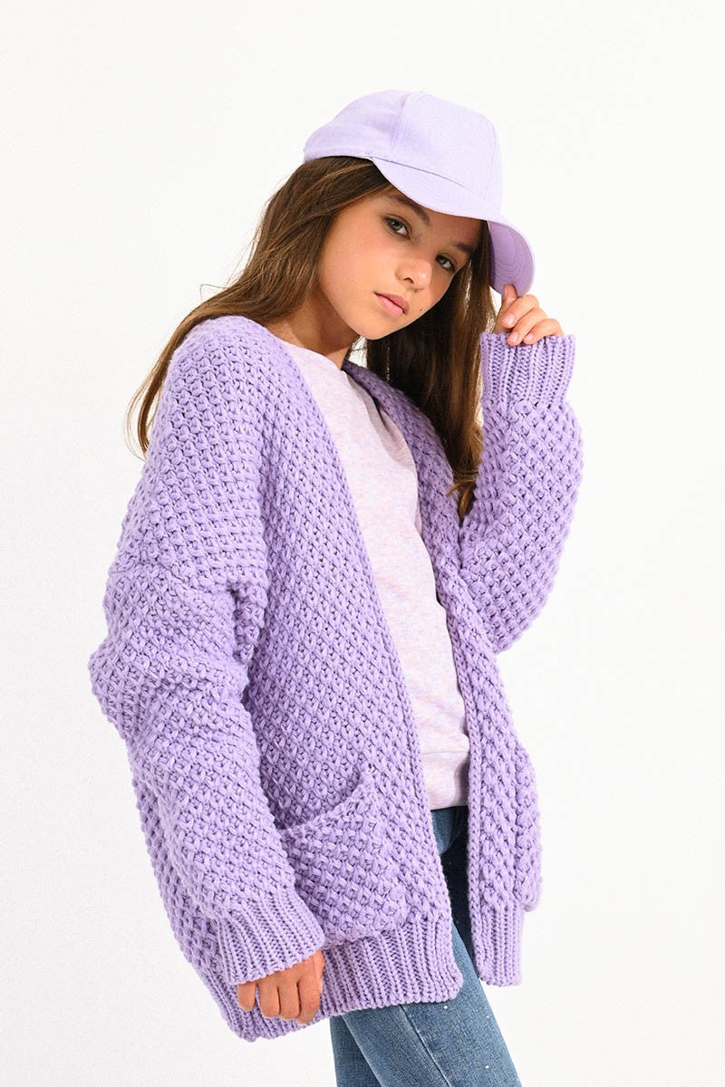 Pineapple knit cardigan Open front, low armhole Side patch pockets Length: 54cm Size 12 years -5cm<12years<+3cm