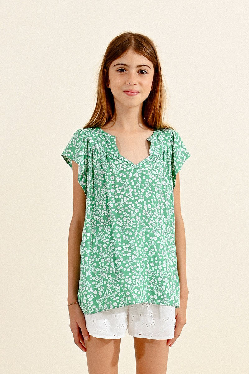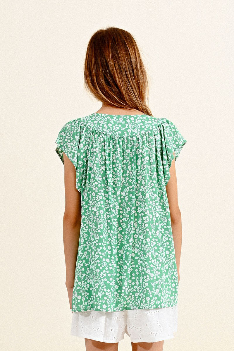 V-neck top with short sleeves, flower print Length : 50cm Size 12 ans -4cm<12ans<+3cm